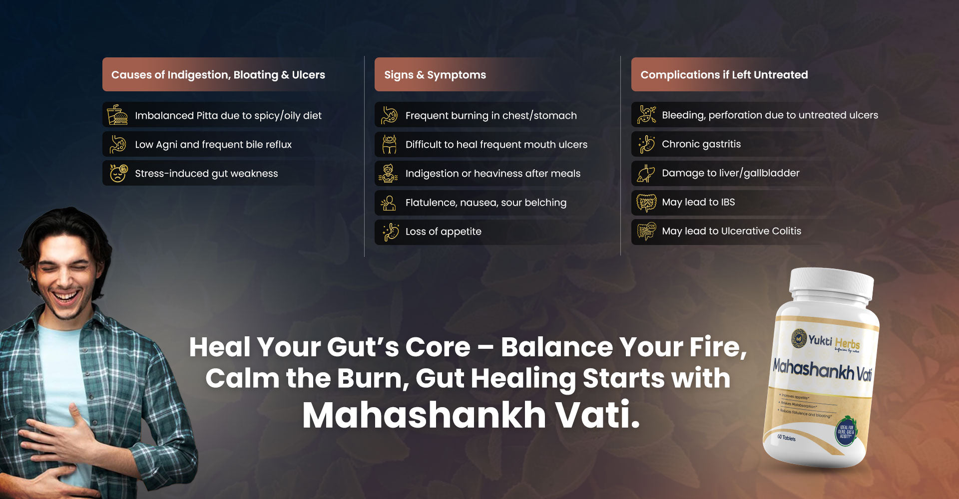 Classical Ayurvedic formula to prevent ulcers | Best for hyperacidity | Reduces bile reflux | Supports liver/gallbladder health | Balances Pitta & Kapha Dosha | Safe for regular gut maintenance | Choice of formulation for all Ayurveda clinicians to address issues like bloating, indigestion, constipation and flatulence | Safe for long-term use