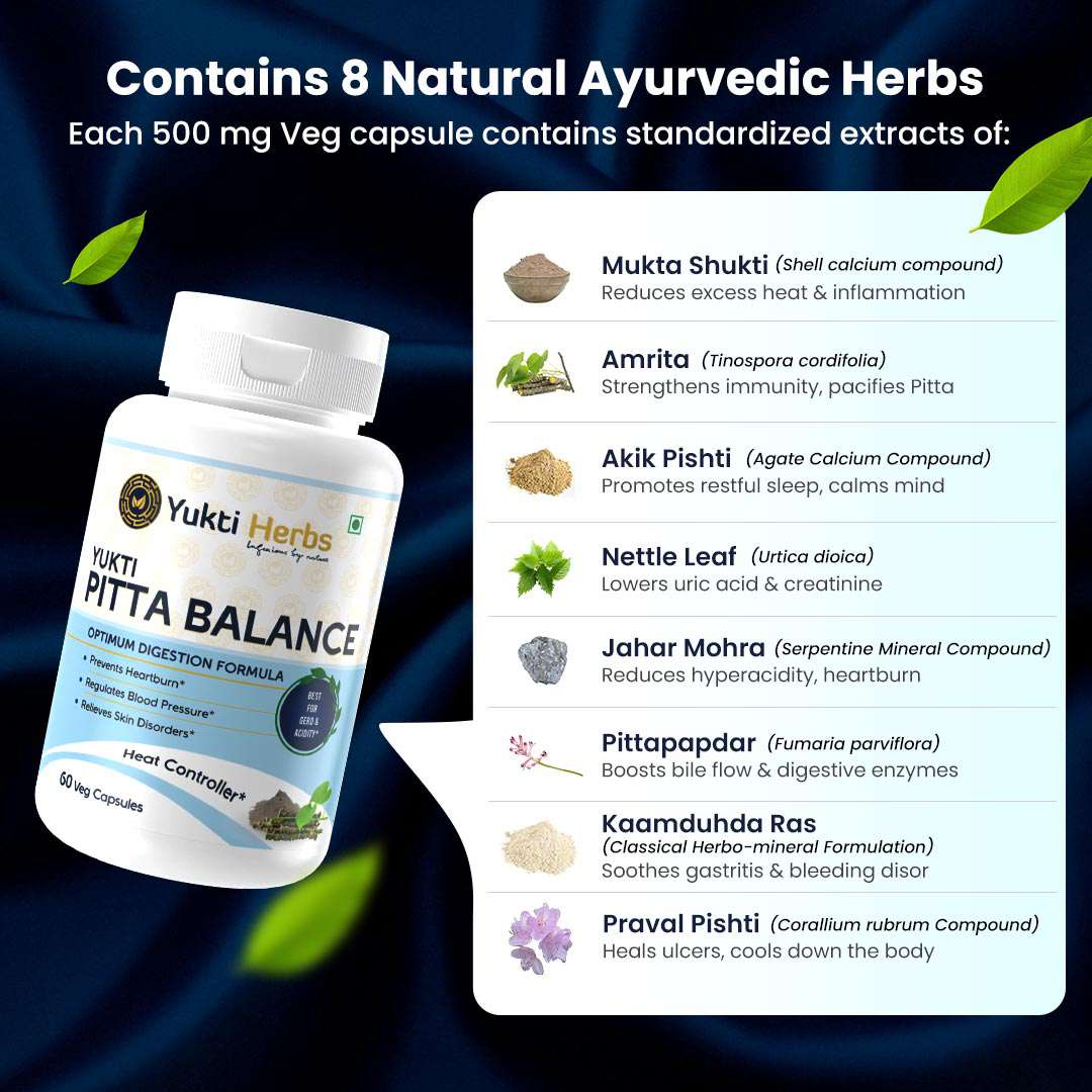 Pitta Balance Capsules – Herbal remedy to balance Pitta dosha. Helps cool the body, reduce acidity, support liver health, and promote overall mind-body harmony.